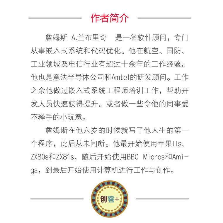 詹姆斯 A.兰布里奇 是一名软件顾问,专门从事嵌入式系统和代码优化。他在航空、国防、工业领域及电信行业有超过十余年的工作经验。他也是意法半导体公司和Amtel的研发顾问。工作之余他做过嵌入式系统工程师培训工作,帮助开发人员快速获得提升。或者做一些令他的同事爱不释手的小玩意。