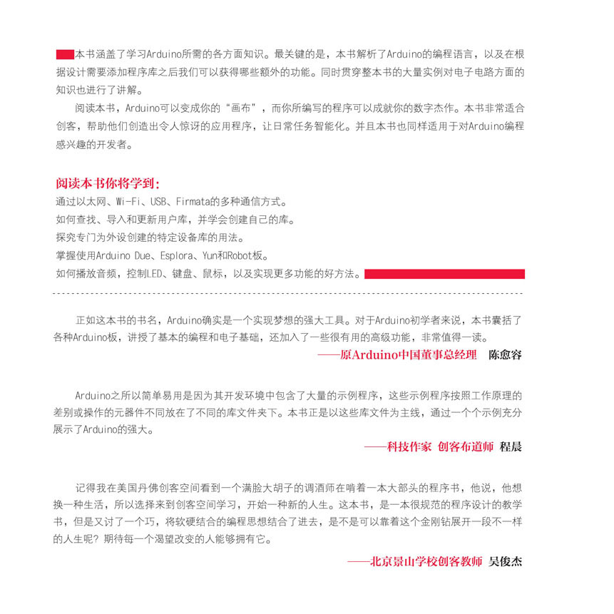 原Arduino中国董事总经理陈愈容、创客布道师程晨、知名创客教师吴俊杰联合推荐。